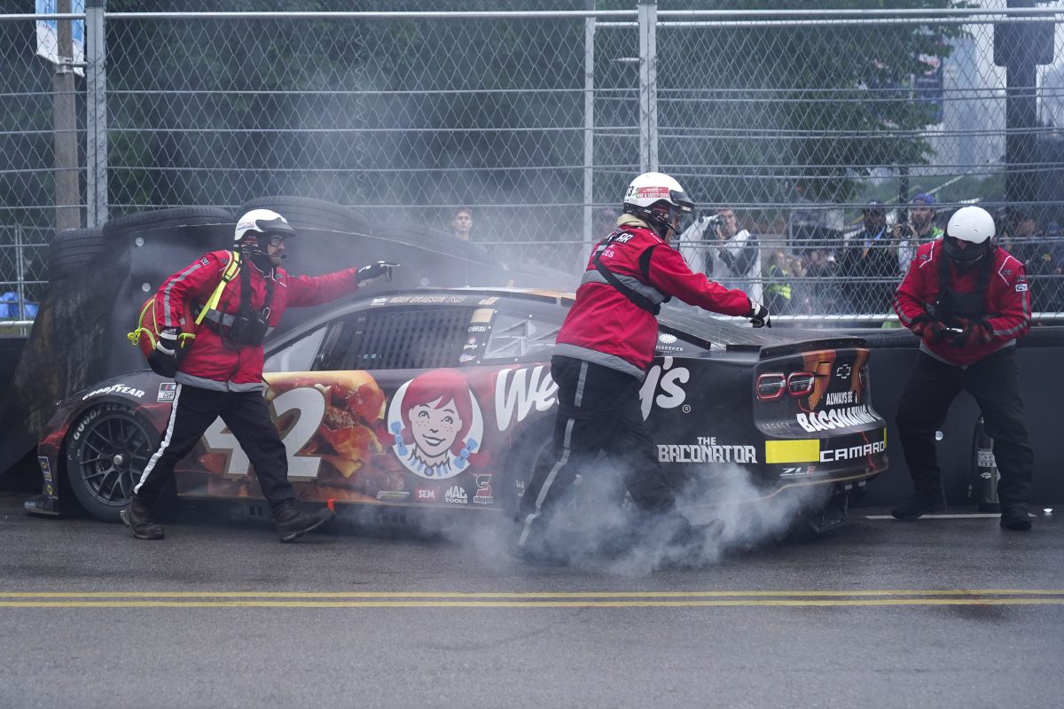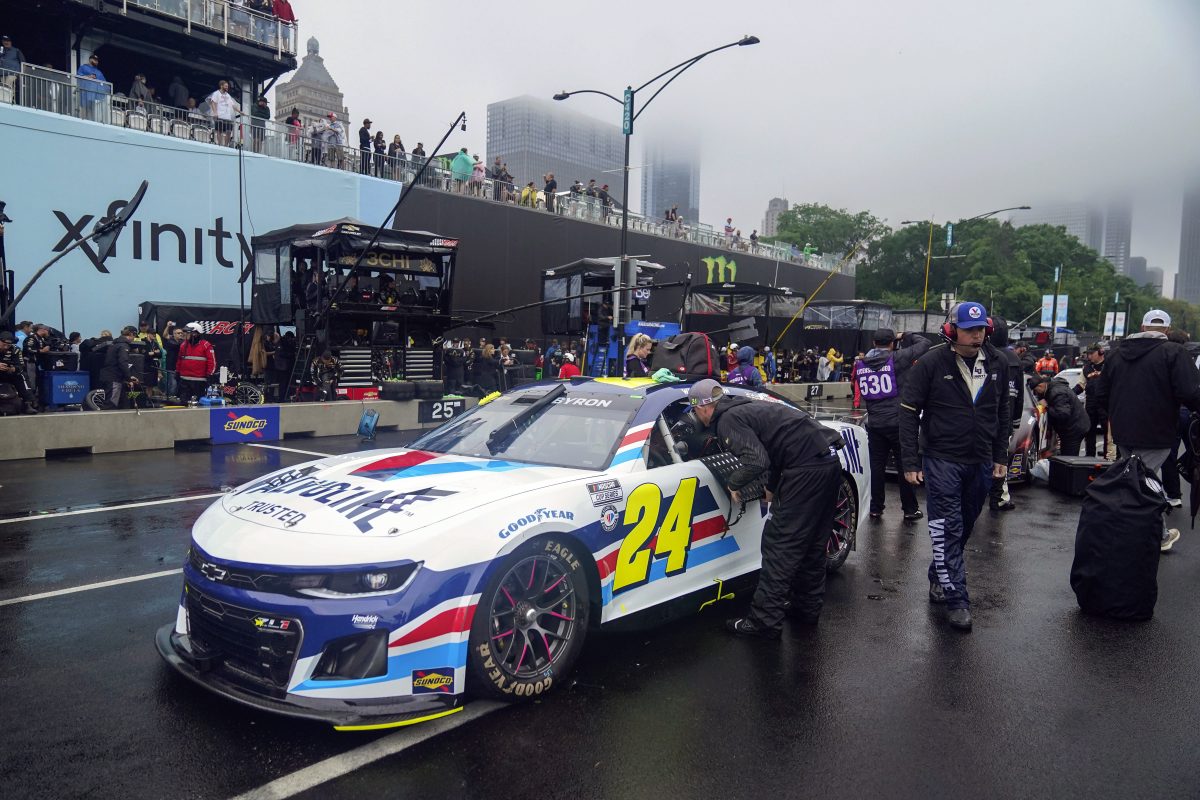 Right before the scheduled start, as the rain persisted, pole-sitter Denny Hamlin took to Twitter to lobby for a delay, and Noah Gragson posted video of one of his tires floating on pit road. NASCAR then decided to allow the drivers to return to their haulers.