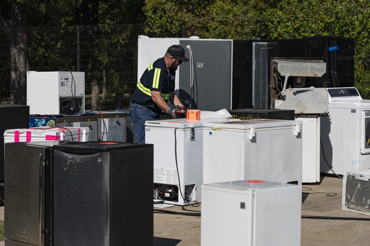 An operator attaches equipment to a used appliance at a customer recovery job site, Monday, Oct. 9, 2023, in Little Elm, Texas. The company A-Gas takes in shipments of refrigerators and tanks from around the country and beyond, drains them, then purifies and reclaims the chemicals, shipping out recycled product. This prevents the need for new chemical production.