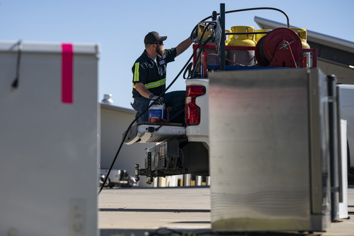 An operator prepares equipment in a truck bed at a customer recovery job site on Monday, Oct. 9, 2023, in Little Elm, Texas. The company A-Gas takes in shipments of refrigerators and tanks from around the country and beyond, drains them, then purifies and reclaims the chemicals, shipping out recycled product. This prevents the need for new chemical production.