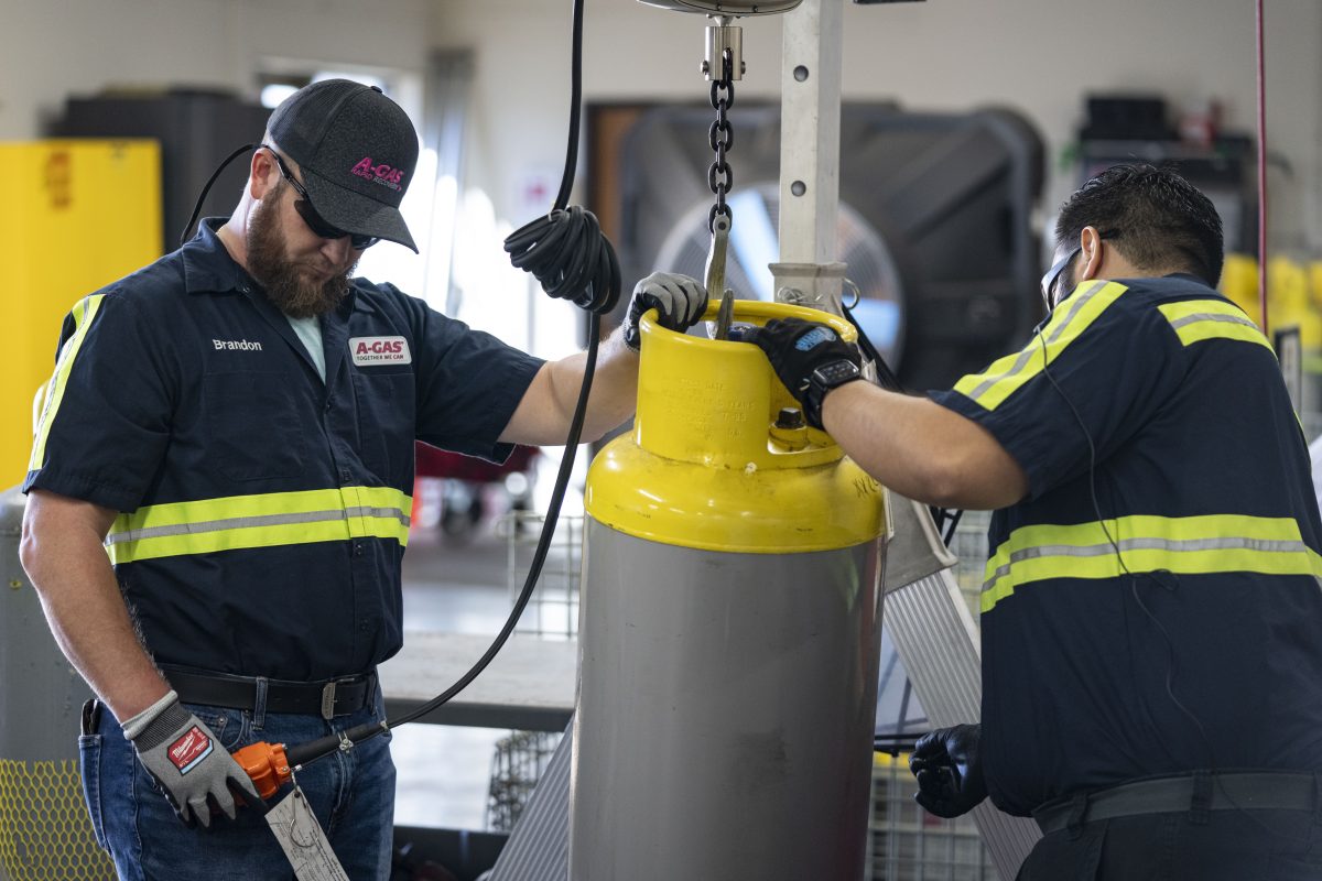 Operators use a hoist to move a used refrigerant cylinder at the A-Gas Rapid Recovery DFW facility on Monday, Oct. 9, 2023, in Arlington, Texas. The company takes in shipments of refrigerators and tanks from around the country and beyond, drains them, then purifies and reclaims the chemicals, shipping out recycled product. This prevents the need for new chemical production.