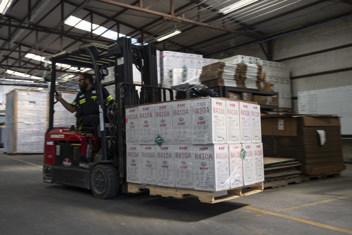 An operator moves a pallet of packaged refrigerant cylinders within a warehouse at the A-Gas Rhome facility on Monday, Oct. 9, 2023, in Rhome, Texas. The company takes in shipments of refrigerators and tanks from around the country and beyond, drains them, then purifies and reclaims the chemicals, shipping out recycled product. This prevents the need for new chemical production.