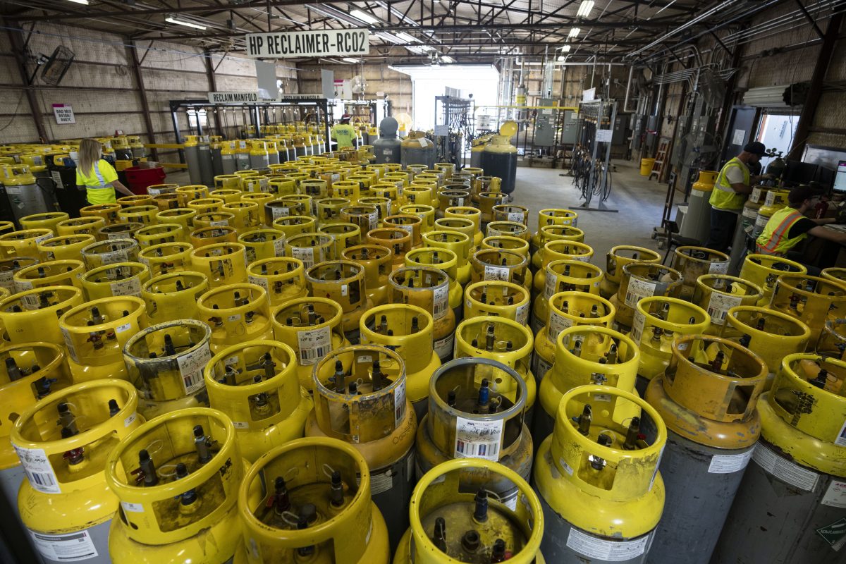 Used refrigerant cylinders are collected in the A-Gas Rapid Recovery DFW facility on Monday, Oct. 9, 2023, in Arlington, Texas. The company takes in shipments of refrigerators and tanks from around the country and beyond, drains them, then purifies and reclaims the chemicals, shipping out recycled product. This prevents the need for new chemical production.