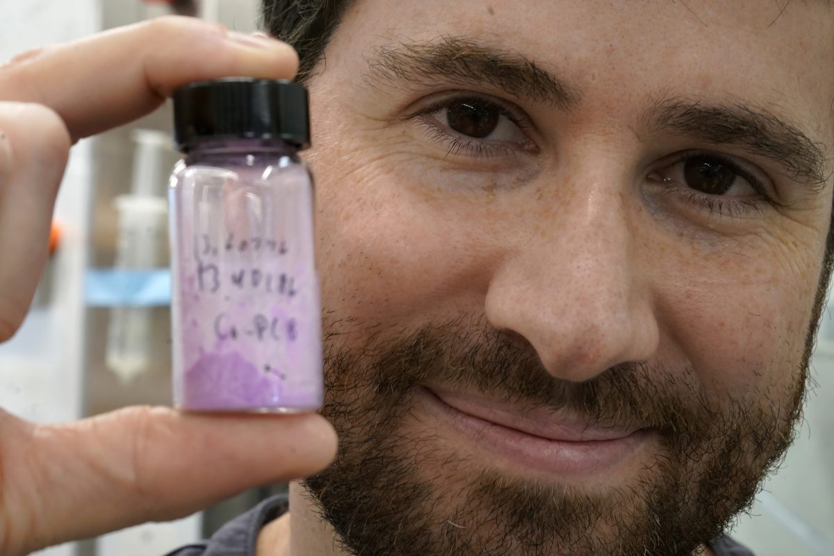 Jarad Mason, assistant professor of chemistry and chemical biology at Harvard University, of Watertown, Mass., holds a vile of cobalt-based hybrid material, Thursday, Sept. 14, 2023, in a lab on the school's campus, in Cambridge, Mass. The material is part of research to develop a more environmentally-friendly solid refrigerant that could be used as an alternative to existing volatile refrigerants.