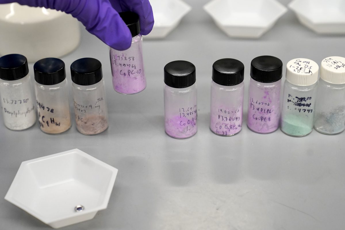 Dan Laorenza, of North Andover, Mass., a post-doctoral researcher at Harvard University, places a vile of cobalt-based hybrid material among other hybrid materials being evaluated as candidates for solid refrigerants, in a lab on the school's campus, Thursday, Sept. 14, 2023, in Cambridge, Mass. The mixtures are part of research to develop a more environmentally-friendly solid refrigerant that could be used as an alternative to existing volatile refrigerants.