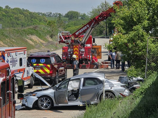 An adult and young child were killed Sunday afternoon when the car they were traveling in crashed nearly head-on into a tractor-trailer on Interstate 70 near the Claysville exit.