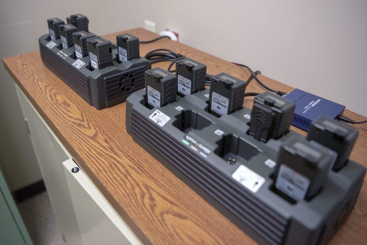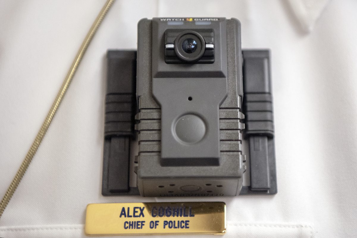 The body cameras, manufactured by Watchguard, are clipped to the front shirts of the officers’ uniforms, at about chest-level.