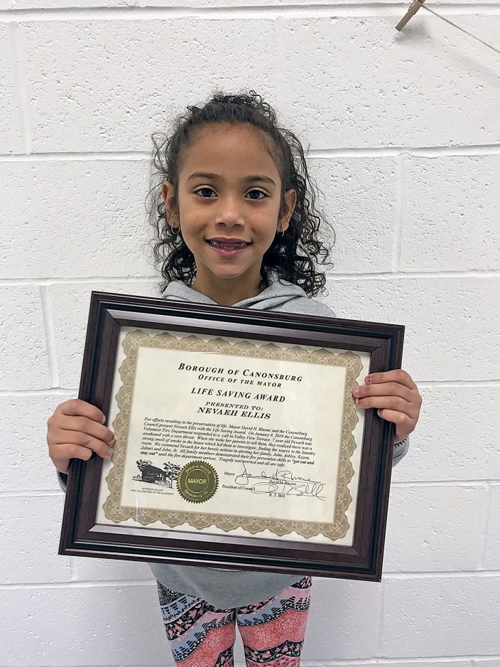 The award reads, “For efforts in the preservation of life, Mayor David H. Rhome and the Canonsburg Council present Nevaeh Ellis with the Life Saving Award. On January 9, 2019 the Canonsburg Volunteer Fire Department responded to a call in Valley View Terrace. 7-year-old Nevaeh was awakened with a sore throat. When she woke her parents to tell them, they realized there was a strong smell of smoke in the house which led them to investigate, finding the source in the laundry room. We commend Nevaeh for her heroic actions in alerting her family. All family members demonstrated their fire prevention skills to “get out and stay out” until the fire department arrives. Tragedy was averted and all are safe.”