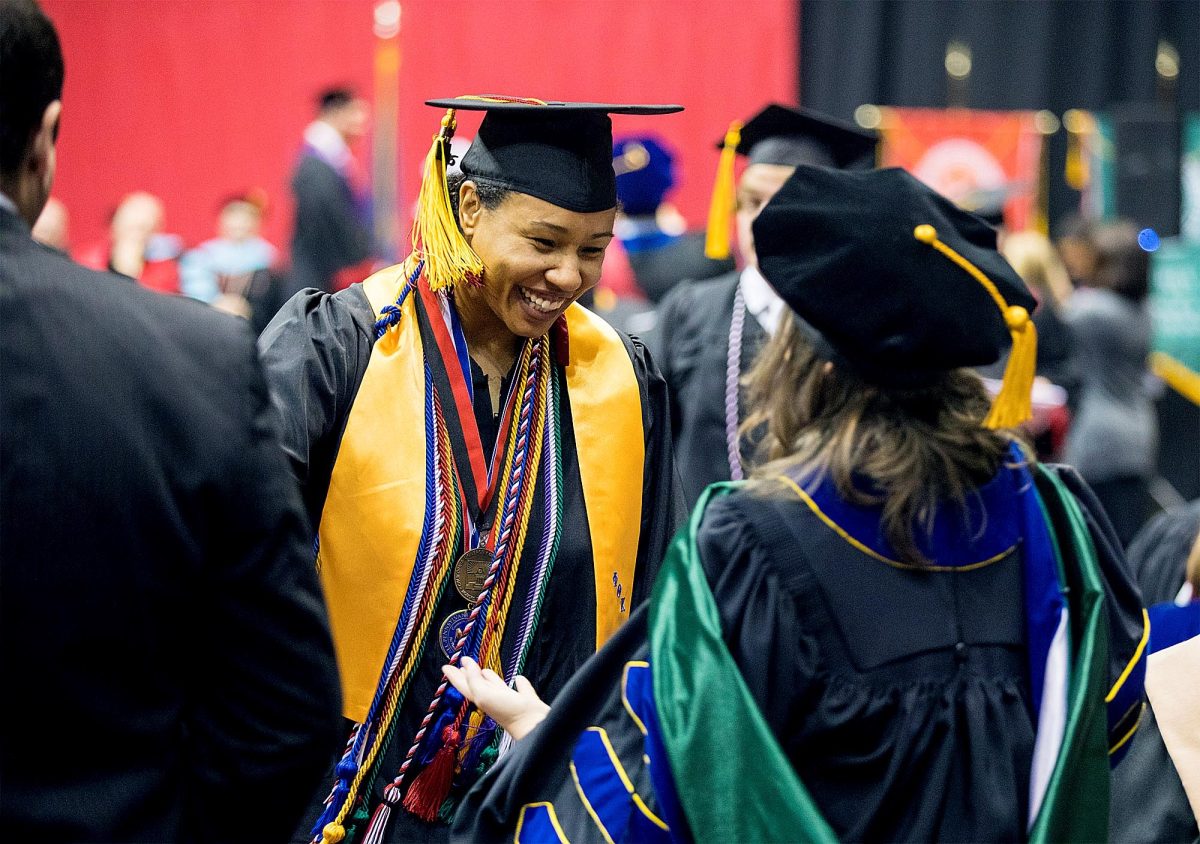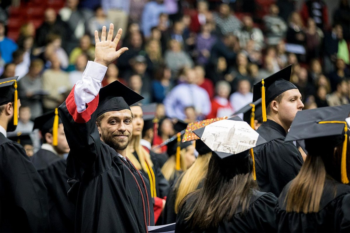 California University of Pennsylvania celebrated undergraduate winter commencement Friday and Saturday, with 548 graduates honored and 714 undergraduates receiving their diplomas. Tinamarie Brown, a biology major from Pittsburgh, above, greets Dr. Sarah Meiss, an associate professor in the Department of Biological and Environmental Sciences, at the undergraduate winter commencement ceremony held at the Convocation Center. Jake Wild, a biology major from Erie, waves to his family before receiving his bachelor’s degree at California University of Pennsylvania’s undergraduate winter commencement ceremony.