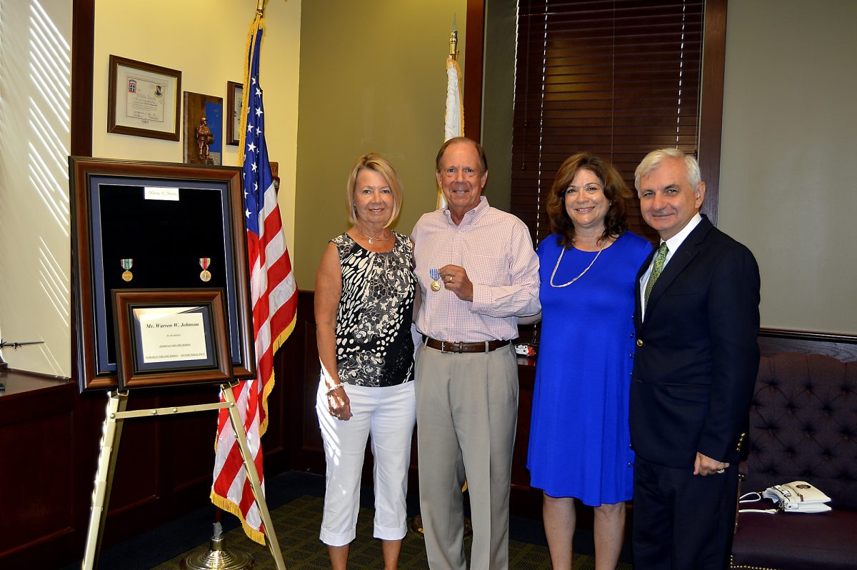 Attending the ceremony and accepting the medals on behalf of their father, who died Dec. 21, 2013, in Washington, were two of his three children, Judy Kent of Wakefield, R.I., and Jeff Johnson, along with his wife, Diana.