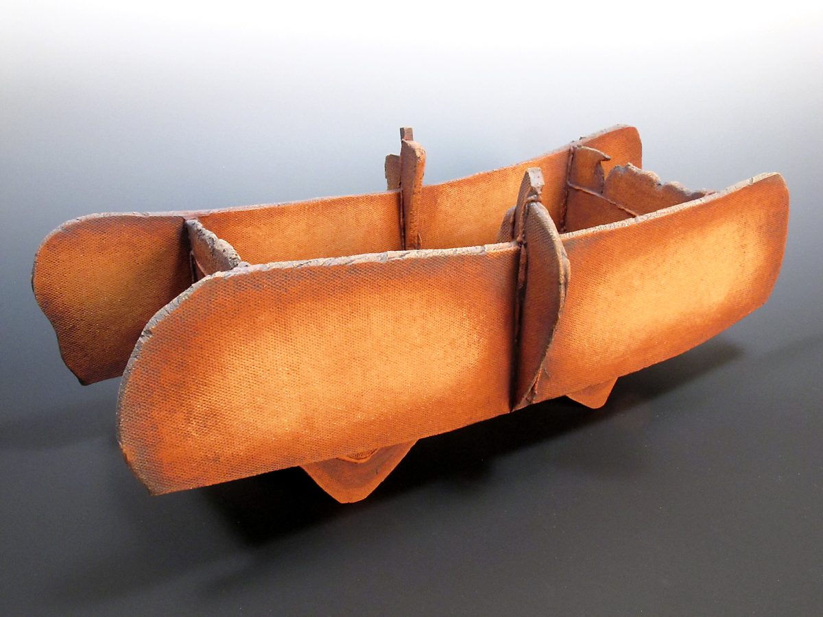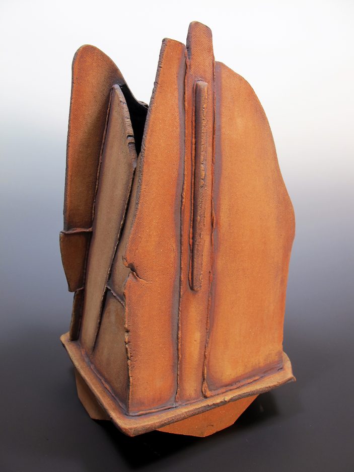 “I also try to use the natural edges of the rolled slabs as much as possible as a balance against the cut edges,” she said. “Borrowing a term from woodworking, I refer to those textured, somewhat randomly occurring slab borders as ‘live edges.’ The finishing process I use is a mishima treatment, in which red iron oxide is brushed over all and then sponged off, creating a contrast of light and dark areas and emphasizing textures. On some pieces, I followed the sponging with some light sanding before firing the pieces to cone six.”