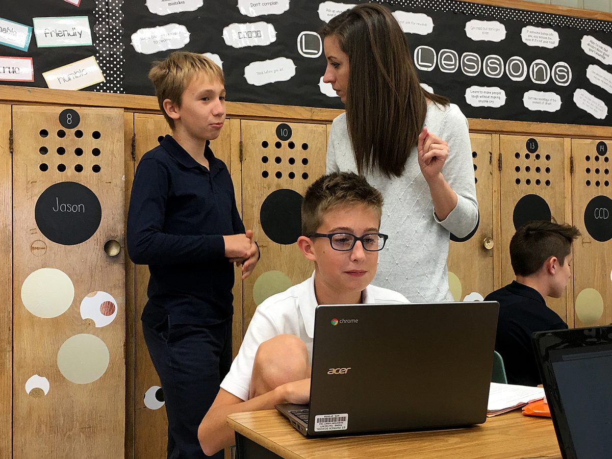 Student Simon Gazarik talks with teacher Nicole Serafini while Mark Ingold works on the heroes project.