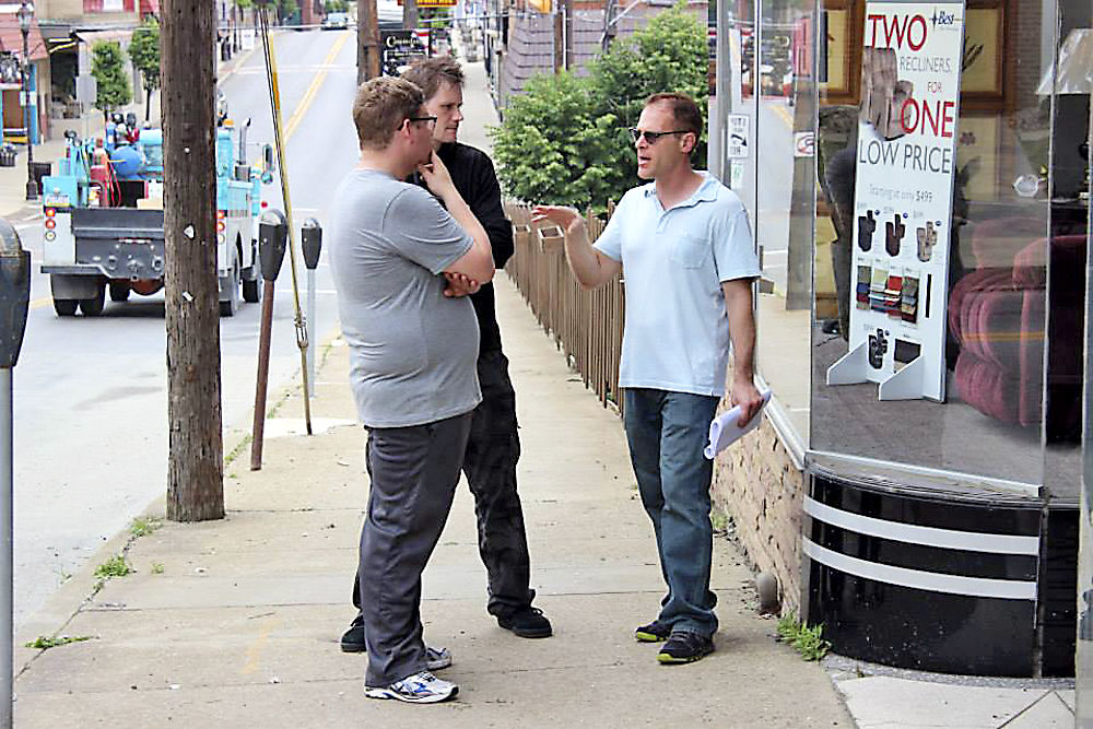 Former Canonsburg resident Eric Paul Chapman, right, directs Chace Beck and Titlebaum before a furniture shoplifting scene in front of Brody’s Furniture on West Pike Street, Canonsburg.