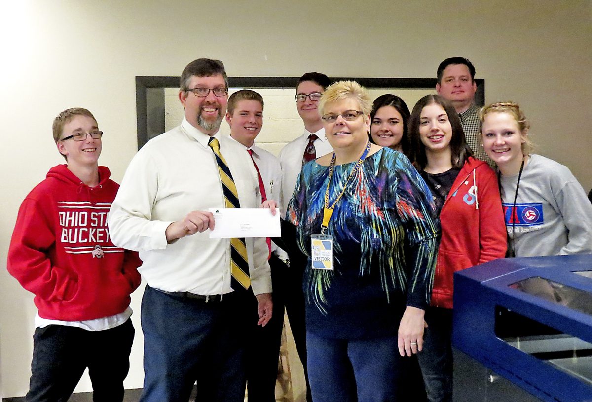 Avella Area School District Superintendent Cyril Walther, front left, technology education teacher Darren Shaffer, rear right, and Avella students recently met with Washington Financial Hickory branch manager Judy Bee, center, to discuss the plans for additional technology in the MakerSpace for grades 7 through 12.