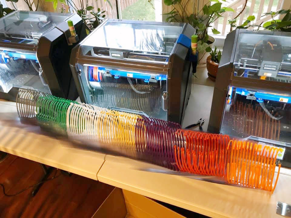 Prentice configured the 3D printers to produce the part of the face shield that can be 3D printed. The part that Prentice is making is a visor that fits around the forehead and includes notches into which a clear face shield fits. The clear shield, a PVC book binding material or transparency film, can be purchased on Amazon.