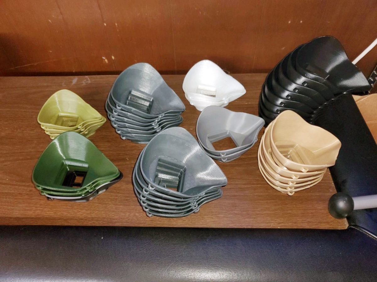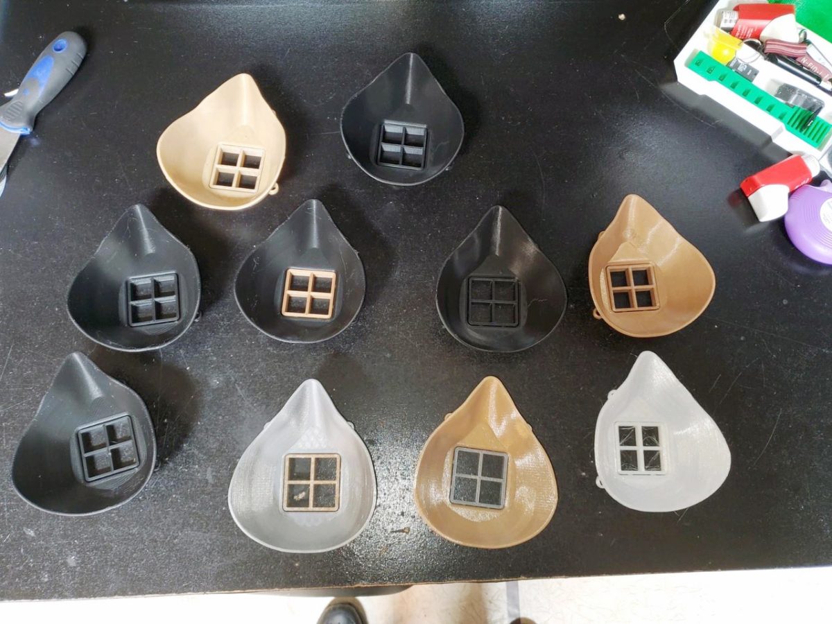 After making the plastic component, the masks are fitted with pieces of surgical masks. Up to 10 filters can be made from one surgical mask.