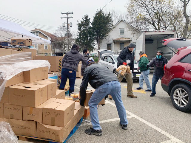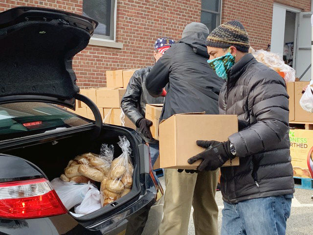 Drivers who showed up stayed in their vehicles while volunteers wearing masks placed the food items – including bread, potatoes and produce – in their trunk.