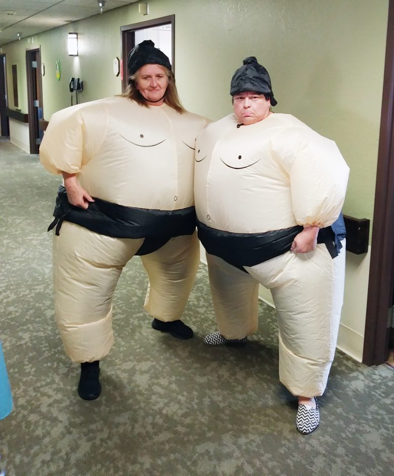 Staff will sometimes try to give the senior citizens a laugh by dressing like a clown or wearing an inflatable sumo wrestler outfit.