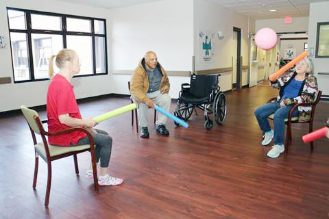 A favorite of the residents at Premier, Kimmel said, is noodle ball. The seniors sit in a circle, six feet apart, while batting a ball around with pool noodles.