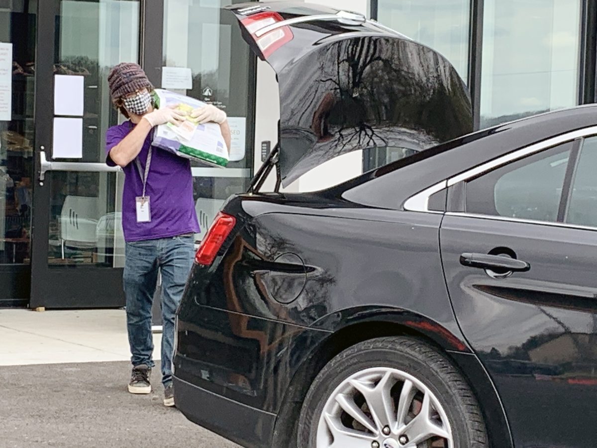 Pickup for the food was no-contact. Workers wore face masks and loaded food supplies into vehicle trunks while individuals remained in their cars.