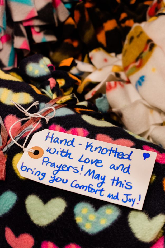 Gavlik ties a third knot – an extra knot – on one tie of each blanket. Three, she said, is her favorite number, “so that way I can put a little bit of myself into each blanket.”