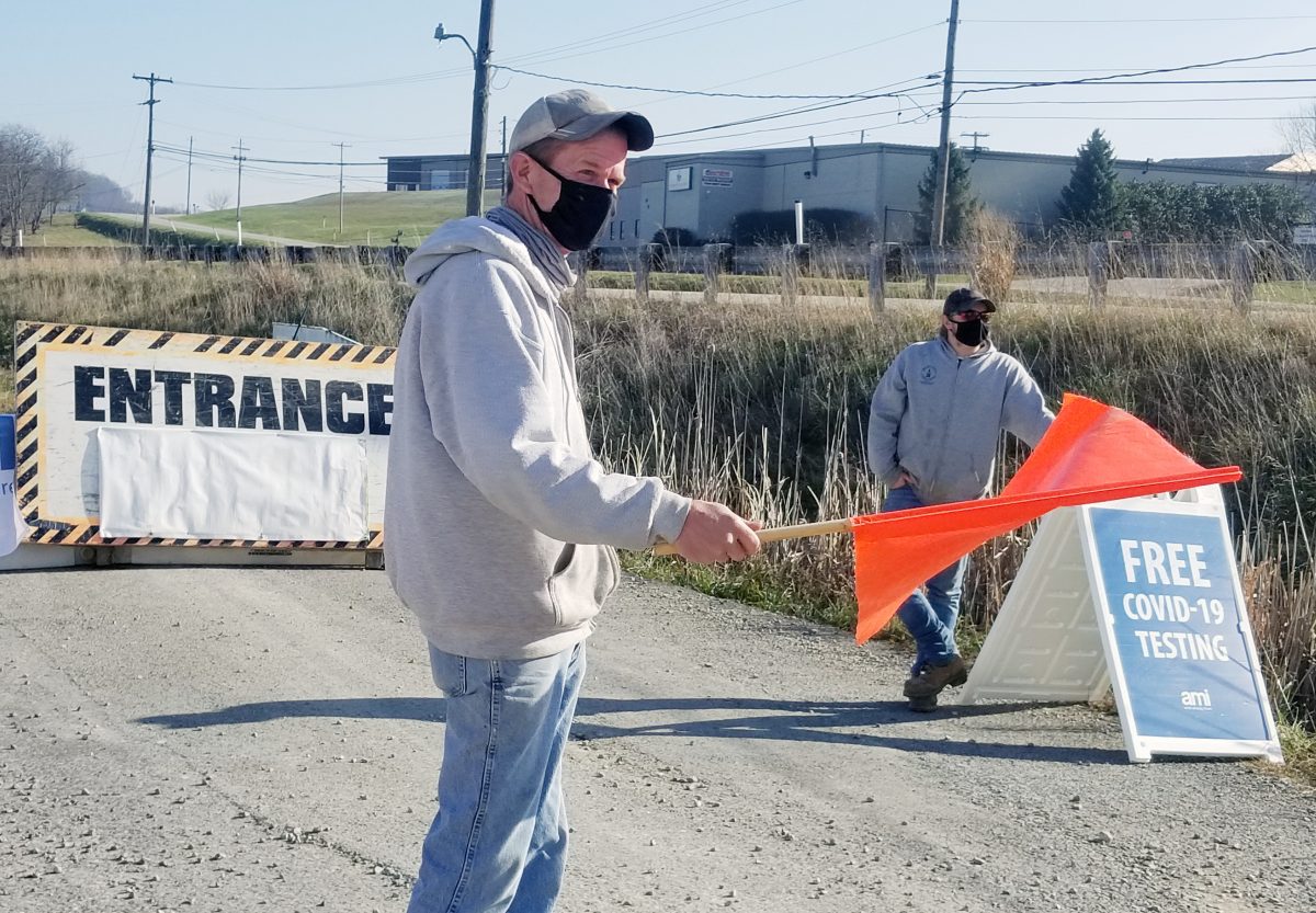 Greene County employee Greg White directs traffic into the testing site at the Greene County Airport on Thursday as Nate Main looks on in the background.