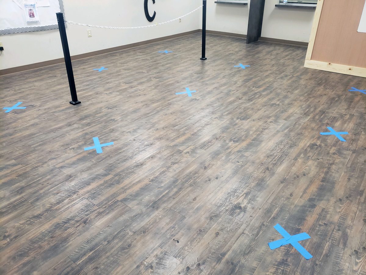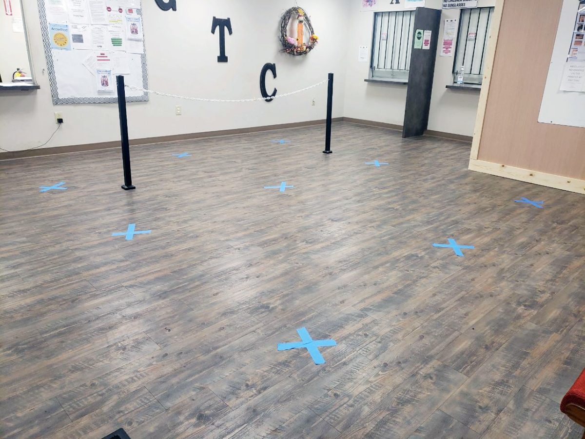 At Greene Treatment Center, X’s are taped on the floor six feet apart indicating where patients must stand while they wait to see a counselor.