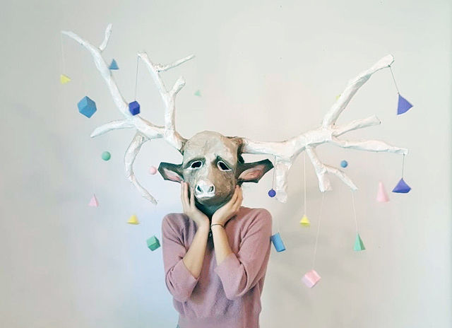 Trujillo paints her masks to look realistic, but then adds abstract shapes to her pieces. She hung paper mache shapes off the caribou’s antlers, and plans to create a crown of abstract shapes for her zebra mask.