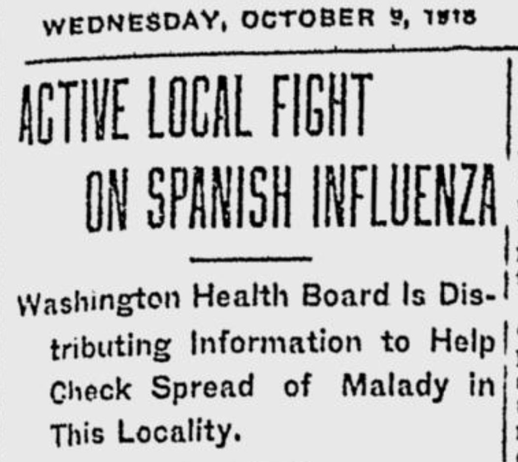 The secretary of Washington’s Board of Health, Thomas W. Henderson, issued guidance to mitigate the spread of influenza in the Oct. 9 edition of the Observer – citizens were urged to keep homes well ventilated, allow sunshine to enter, sleep with windows open and take plenty of exercise.