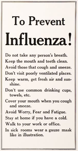 It read: “Don’t cough. Don’t Sneez. Don’t spit. Don’t crowd. If you must cough or sneeze use a handkerchief. If sick go to bed and stay there. By Order of the State Commissioner of Health.”
