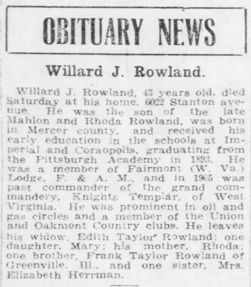 On Oct. 12, just one week after attending a meeting of the Seminary’s Board of Trustees in Washington, apparently in fine health, Williard J. Rowland died suddenly in Pittsburgh.