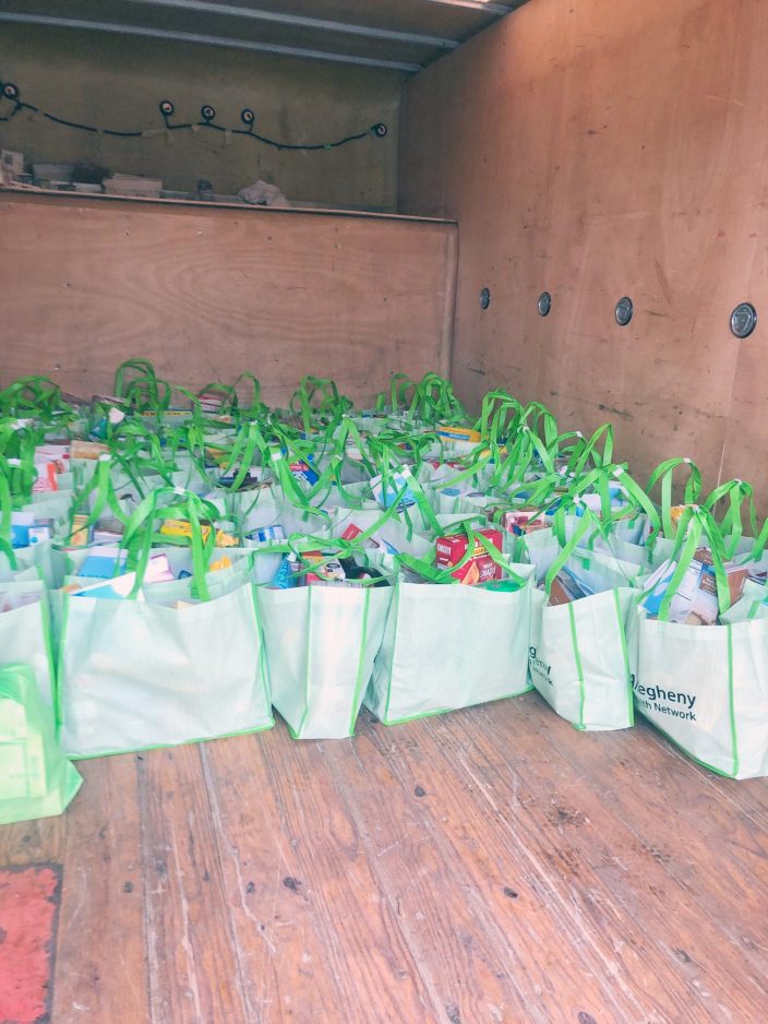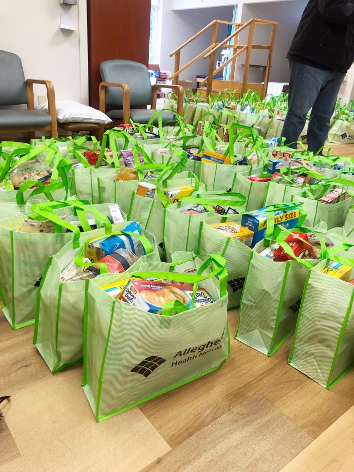 The donated goods, including items like peanut butter, bread and cereal, were packed in tote bags by hospital staff. They will later be delivered to families whose children attend Allison Park Elementary School.
