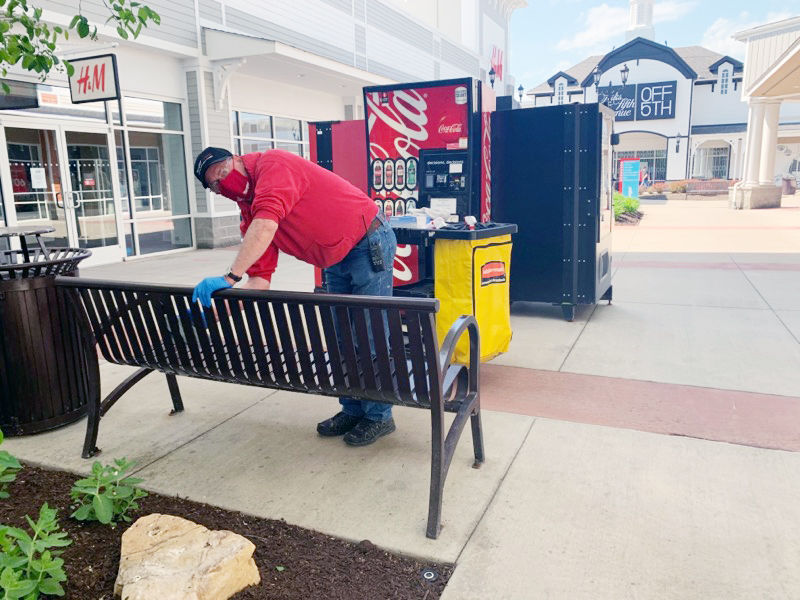 Sandwich billboards posted at Tanger welcomed back shoppers and assured them safety was a priority, noting the company is cleaning and disinfecting frequently and regularly with CDC-approved products at all common areas, including restrooms, food locations, seating areas, tables, playgrounds, signage, digital screens, doors and handles.