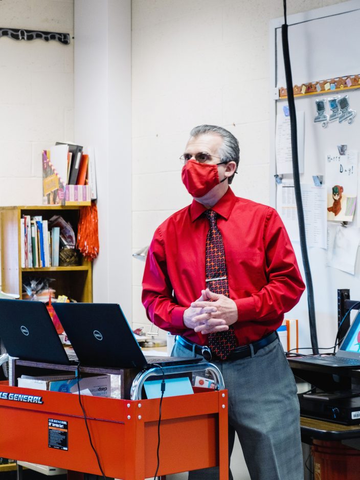 Narigon, donning a face mask that frustratingly fogs up the wire-rimmed glasses he wears, spends his school days teaching science and social studies classes to the students who attend in-person, while simultaneously live-streaming the class to students who opted for remote learning and attend Narigon’s classes from home on their laptops.