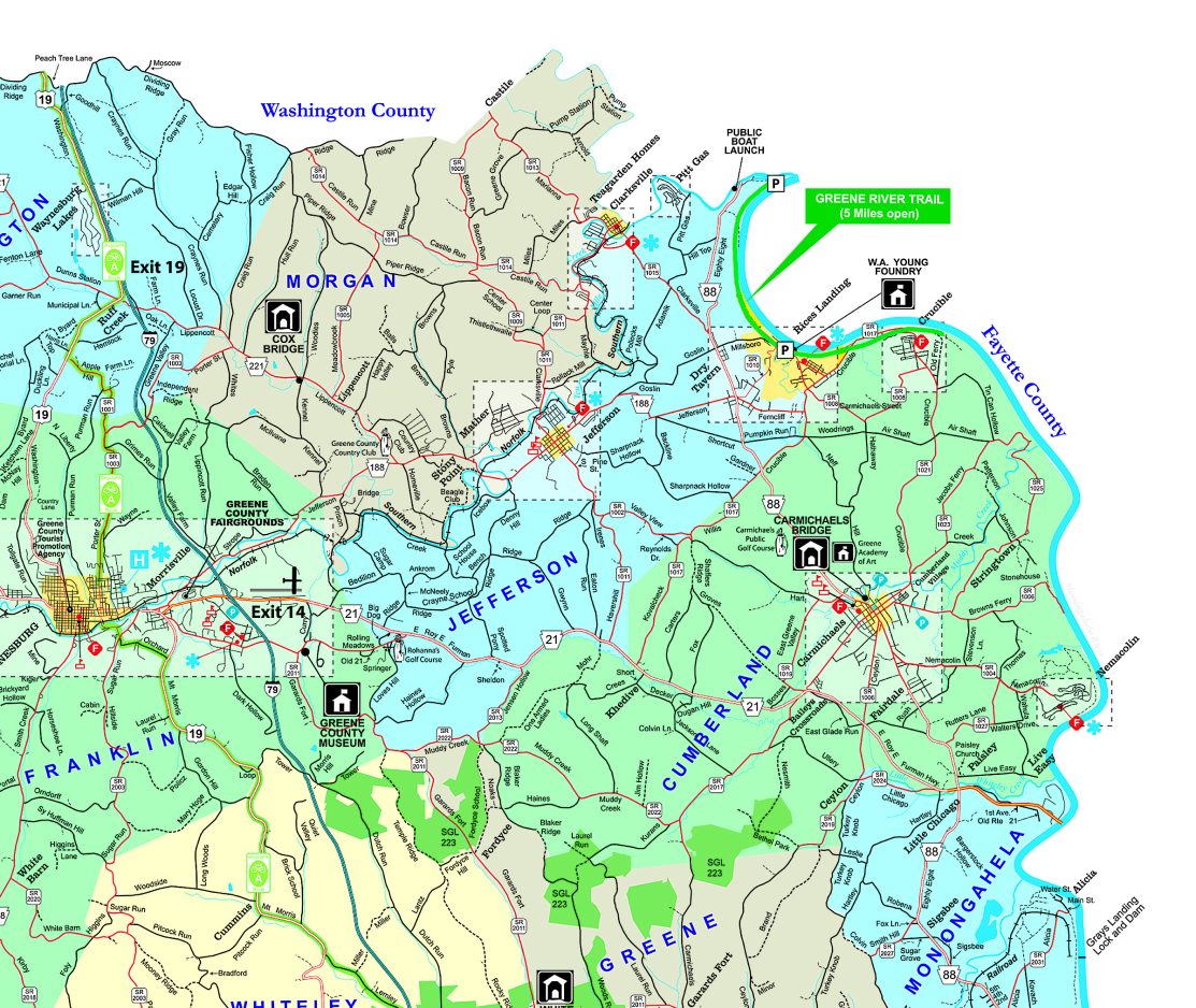 The Greene River Trail follows an abandoned railroad bed along the western bank of the Monongahela River. Its crushed stone surface now stretches 5.2 miles from the northern trail head at the Greene Cove Yacht Club off Route 88 in Jefferson Township to the site of the former Arensburg Ferry on River Road near Crucible, Cumberland Township.