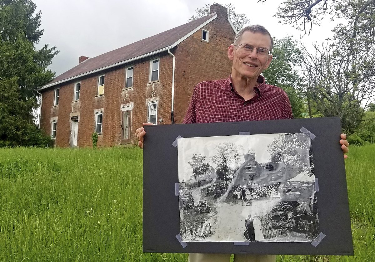William Miller, a descendant of the Rev. John Corbly, stands in front of the historic Corbly house that was built near Garards Fort in 1796 just after Corbly was released from federal custody after being accused of participating in the Whiskey Insurrection that swept through Western Pennsylvania in the early 1790s.
