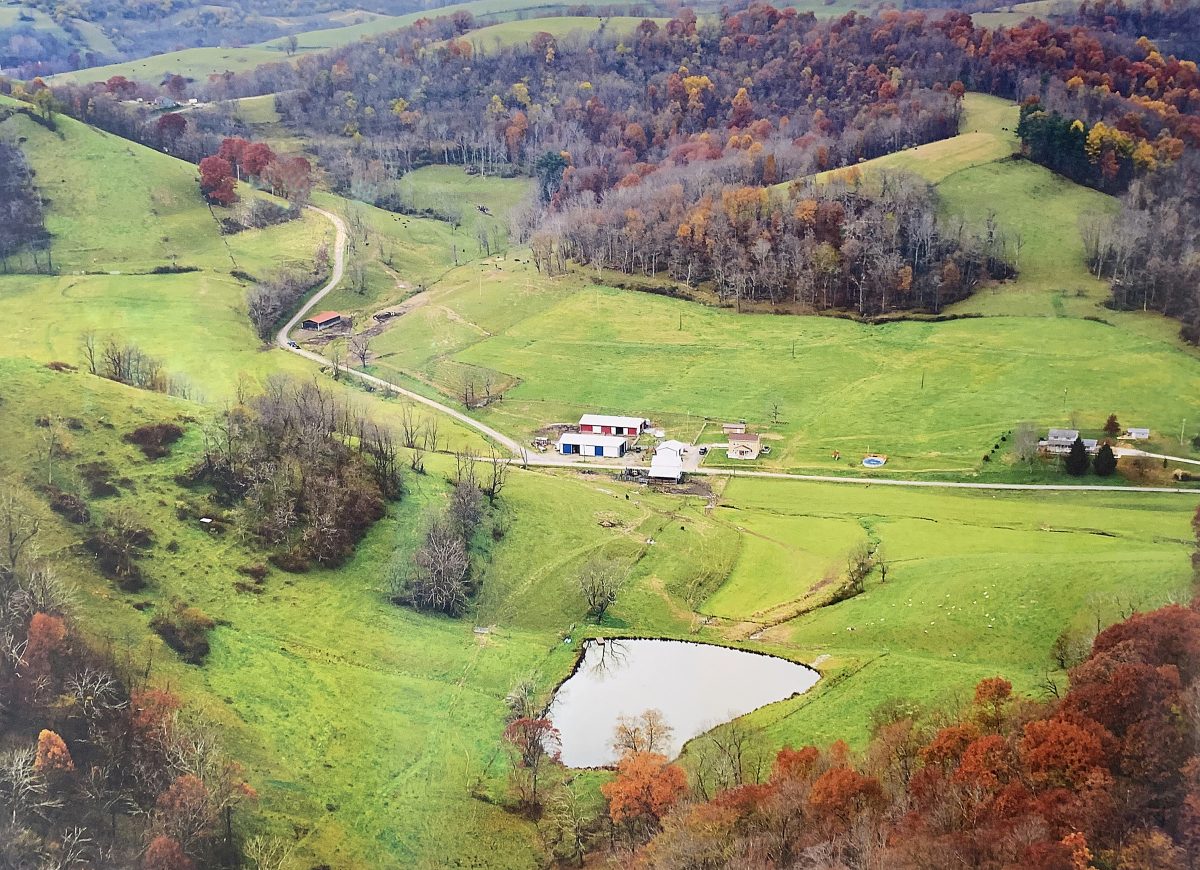 “That’s me on the tractor,” Hughes points to a dot on the road cutting through the lush vista of autumn leaves framing acres of healthy pastures that stretch from the road in all directions, climbing the hillsides, cupping the pond and framing the farmhouses and buildings below. The house in the center, surrounded by barns and outbuildings, is where Hughes grew up in a family of educators including father Byron, the first vo-ag (vocational agriculture) teacher in West Greene School District.