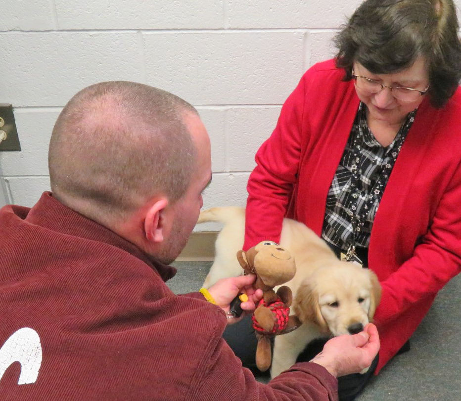 Part of the early training while in Greene County also includes volunteers from the community who take the pups out for a day of car rides, shopping, visit nursing homes and generally getting used to the outside world.