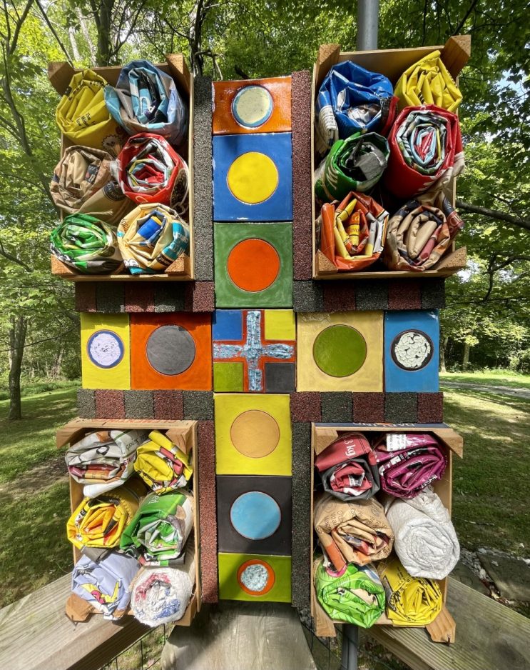 I first wrote about Hallam for the Winter 2011 edition of Greene County Magazine. He had found new inspiration in what he and others were bringing to Greene ARC’s recycling center in Prosperity – kitty litter bags, old books, brightly branded boxes and junk mail. In his eyes, it was a creative romp of color, form and function. Clay, after all, is the original recycled material, and it’s renewable, he told me with a grin – the earth is always making more. Kyle added these cultural throwaways to his clay assemblages, matching the colors of corporate advertising with the glazes on his low-fired ceramics. It was a perfect visual fit.