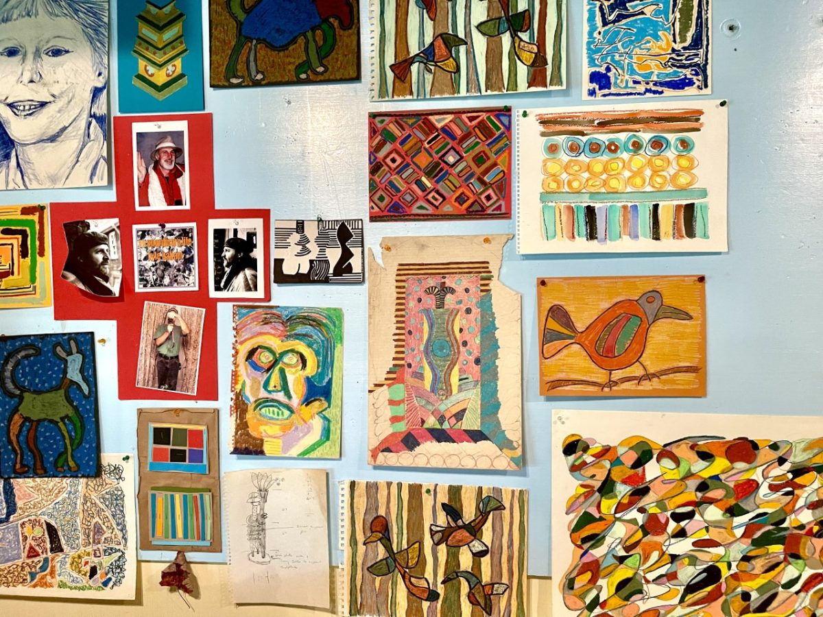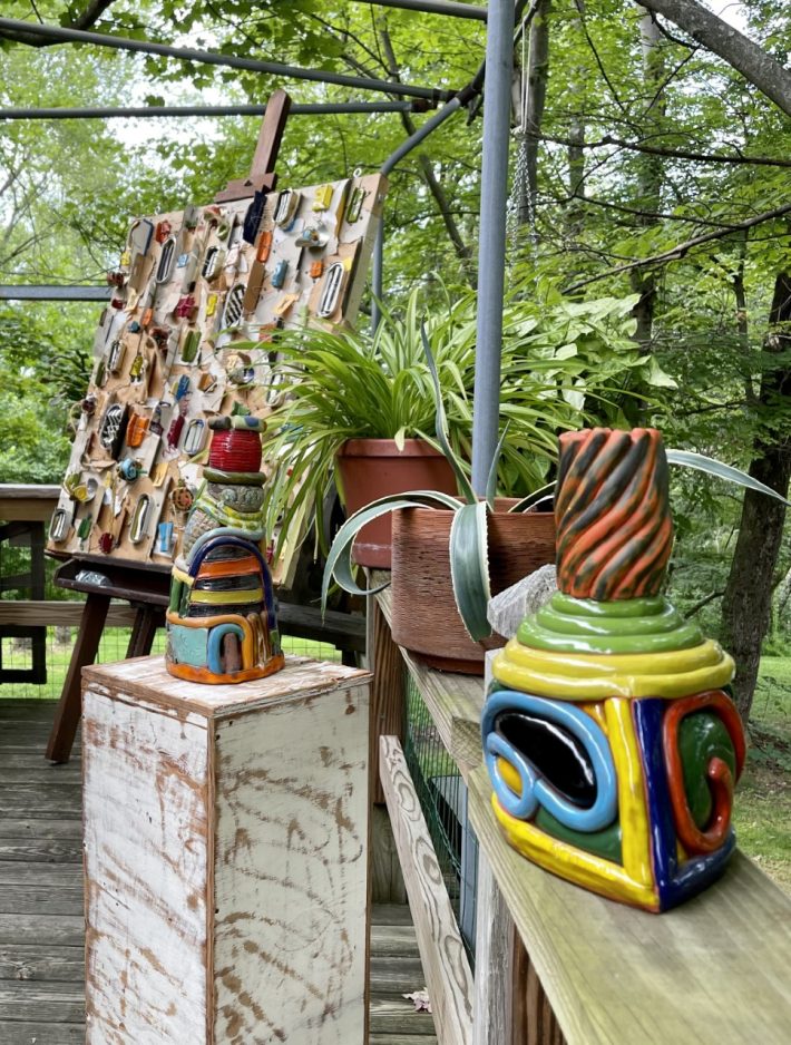 “I was amazed by the volume of his art – the directions and range that I wasn’t even aware of,” Phillips said. The exhibit she helped organize that greeted us on July 31 was an explosion of color, texture and form – a visual, tactile celebration of life. Paintings and sculptures were everywhere, hanging from porch rafters, scattered on the lawn, covering the walls and tables inside the house. The extensive workshop had hundreds of items arranged on tables and lining the edges outside. It was a one-day-only exhibit that would soon be no more. Ellen’s invitation to friends said simply: “Kyle made it clear that he wants his family and friends to enjoy his work. No payment is needed but donations to the Humane Society of Greene County in Kyle’s memory will be greatly appreciated.”