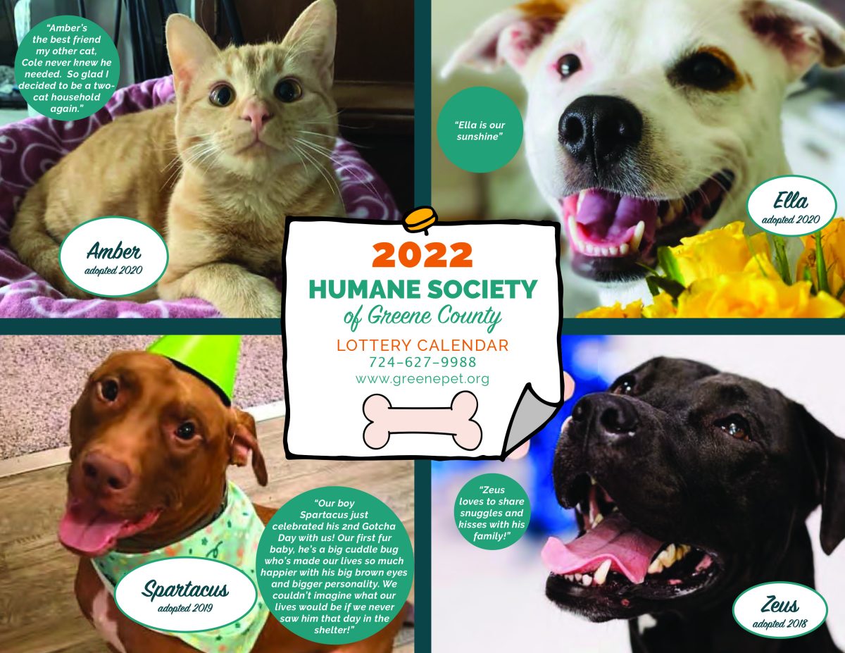 The bright, cheerful calendars filled with photos of happily-adopted pets can be purchased for $30 online at https://greenepet.org/product/2022-humane-society-of-green-county-lottery-calendar/.