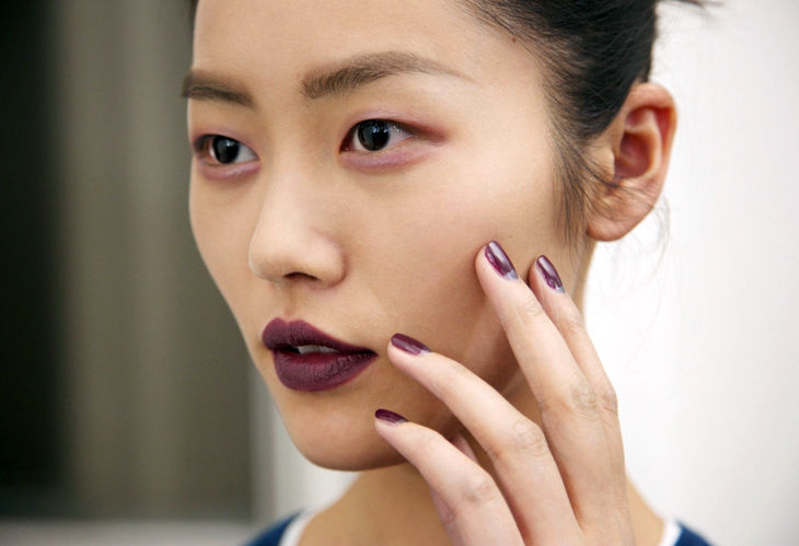 On the runway, man-tailored suits often are paired with classic red lipstick, but Sewell likes purples and magentas and berry shades, largely because she thinks they’re an easier color range to pull off. “It’s very feminine and it’s going to make the lips look shapely and the eyes will gravitate toward them. It’s a modern Technicolor, Marilyn Monroe.”