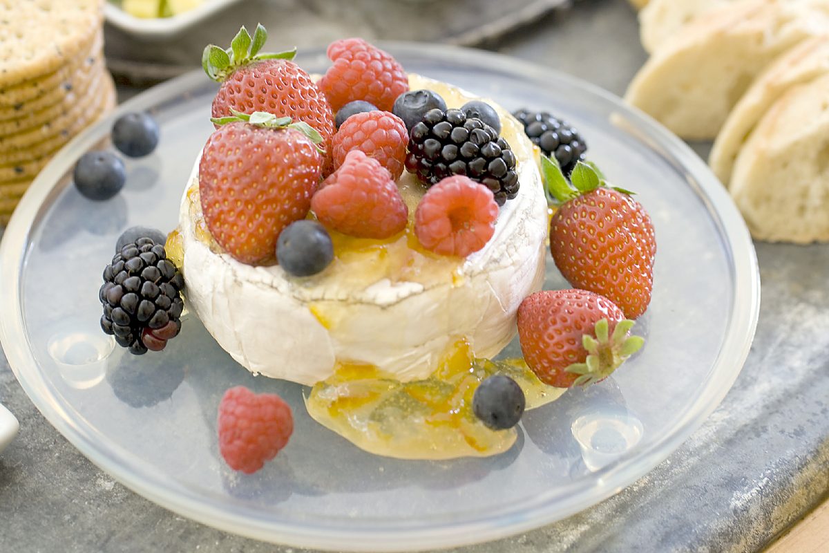 • Place a round of brie in a small, shallow baking dish. Bake at 250 degrees for 10 minutes, then top with fresh berries and drizzle with warmed orange marmalade.