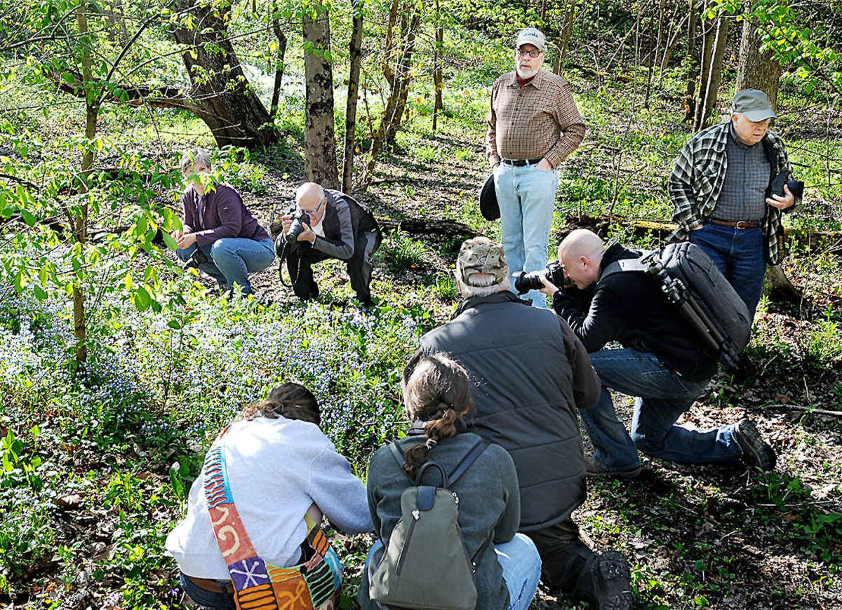 Members of the Western Pennsylvania Lensshooters Camera Club in Peters Township photograph a cluster of blue-eyed Mary wildflowers during a field trip to Cedar Creek Park in Rostraver Township. The wildflowers were in full bloom along the trail through the park near the stream.