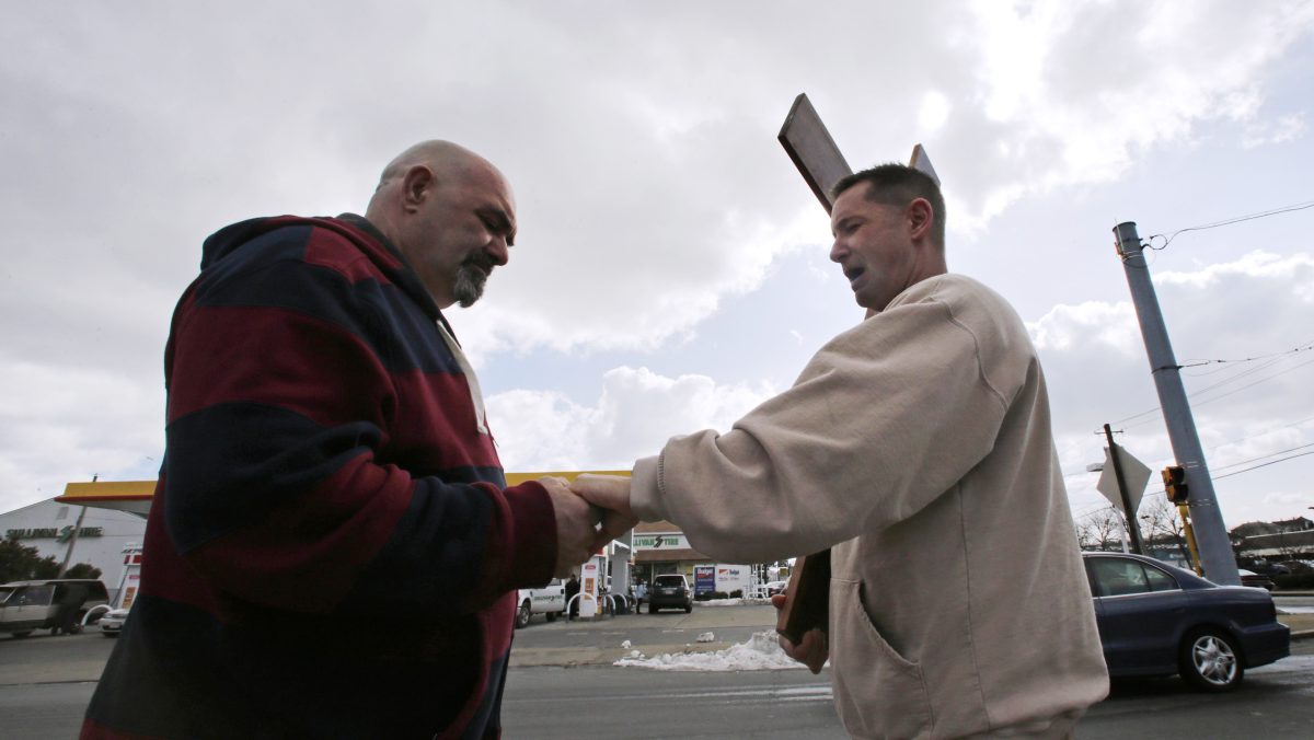 On a recent February afternoon, horns honked and a middle finger flew as Cabral walked the traffic island. Drivers also kept engaging him, trying to answer the question on his cross, which he’d explain meant, “Are you ready to face God when you die?” Cabral would share how he knew that he was, then hand out a card with a gospel message and his church’s address.