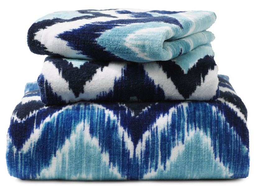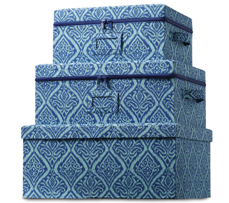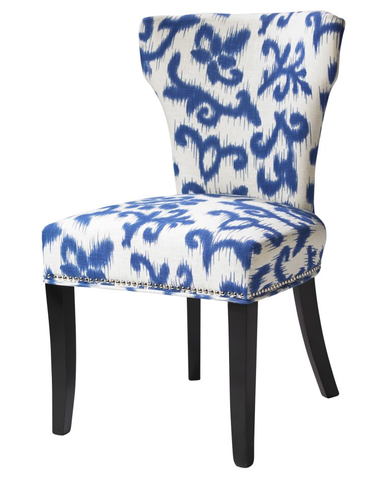 Homegoods has well-priced, indigo printed upholstered chairs, fabric-covered storage boxes and ikat patterned towels. (www.homegoods.com)
