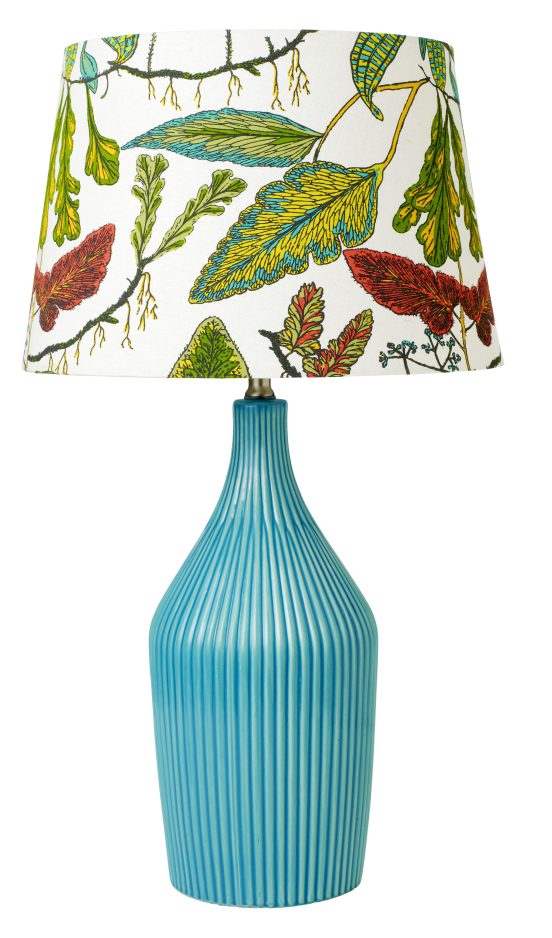 Safavieh offers the Paris ceramic table lamp in a gentle light blue or the more emphatic navy. An upholstered ottoman in powder or ink would be a chic addition. (www.safaviehhome.com )