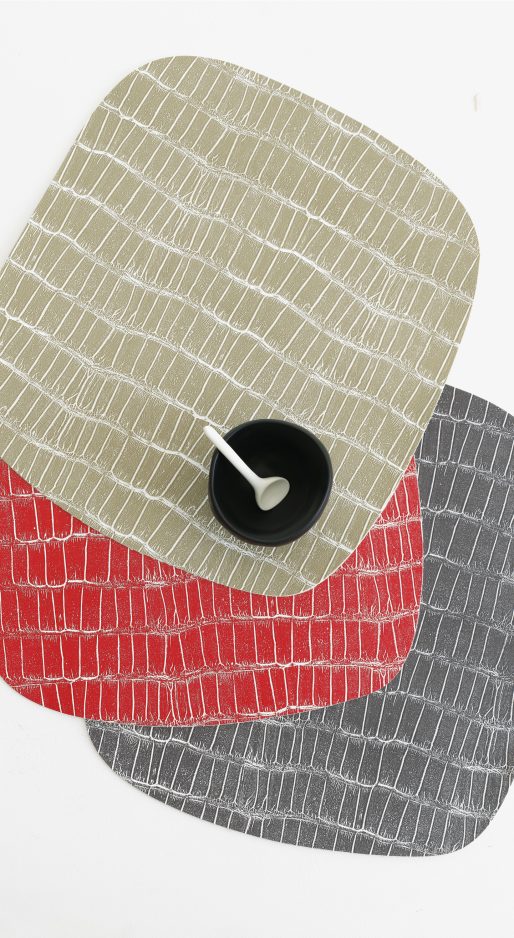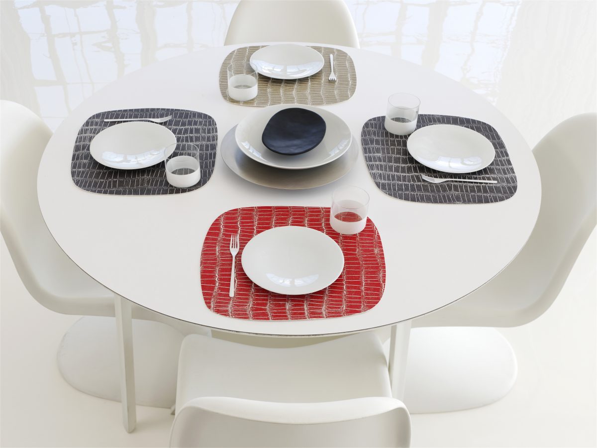 New York designer Sandy Chilewich continues to experiment with her woven vinyl material, producing an array of textured mats in neutrals, metallics and colors. There’s a hand-silkscreened, brushed-dot pattern, a delicate filigreed foil mat, faux printed cowhide, and a hip mod croc pattern in red, black and tan. (www.chilewich.com for retail locations.)