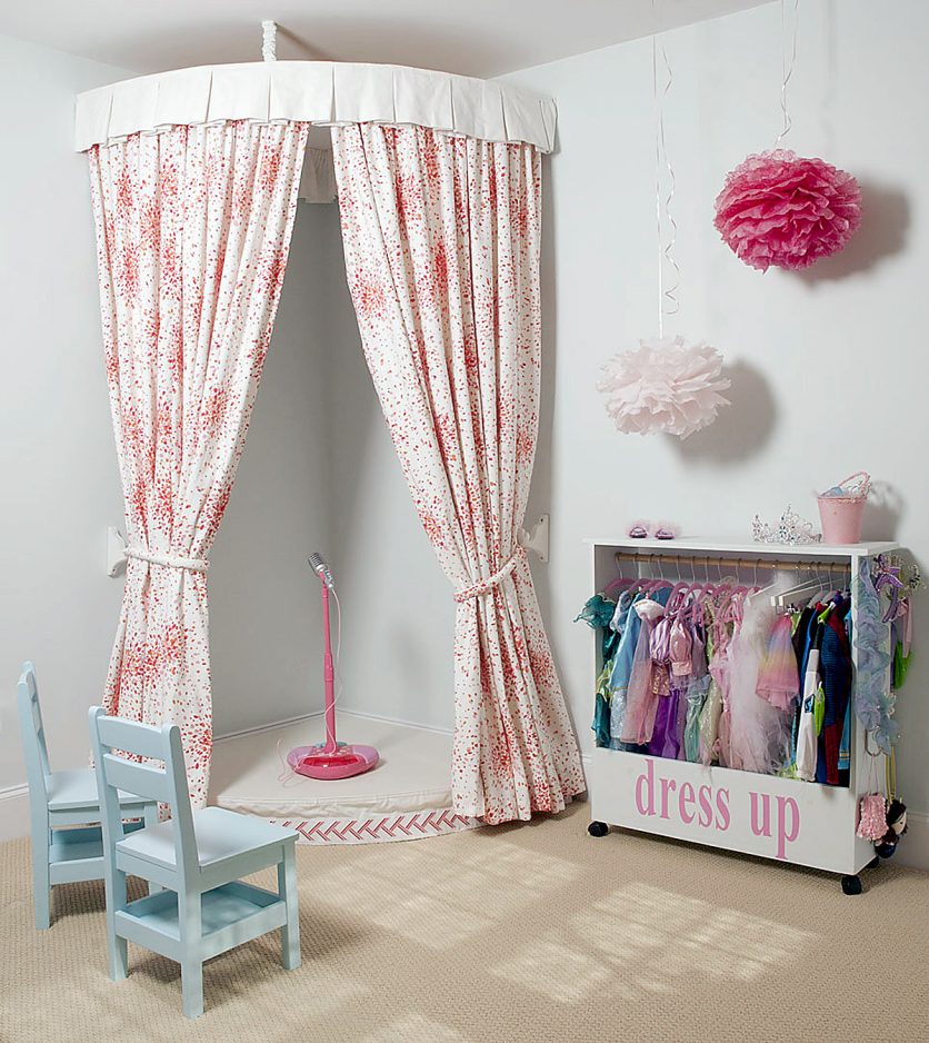 If contemplative is not your family’s speed, Fluhr suggests using the bonus room as an off-off-off-Broadway theater. For a kid who likes to perform skits, play songs and choreograph dances, build a basic plywood stage in the corner of the room. Above that riser, hang a rounded shower-curtain rod and a pair of dark, tab-top curtains. Hang costumes and dress-up clothes in a cubby, and store puppets, musical instruments and other props in a toy chest. Finish by hanging a mirror at tyke height so children can watch themselves rehearse, and don’t forget to add a few comfy chairs for the audience.