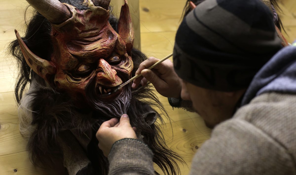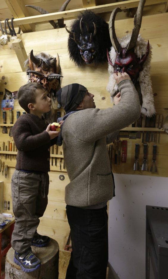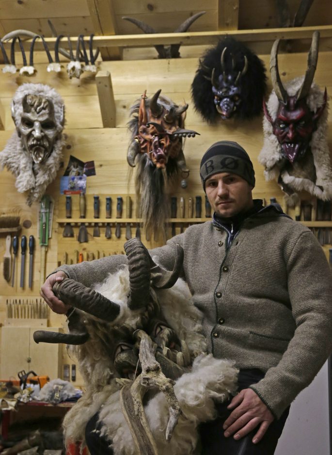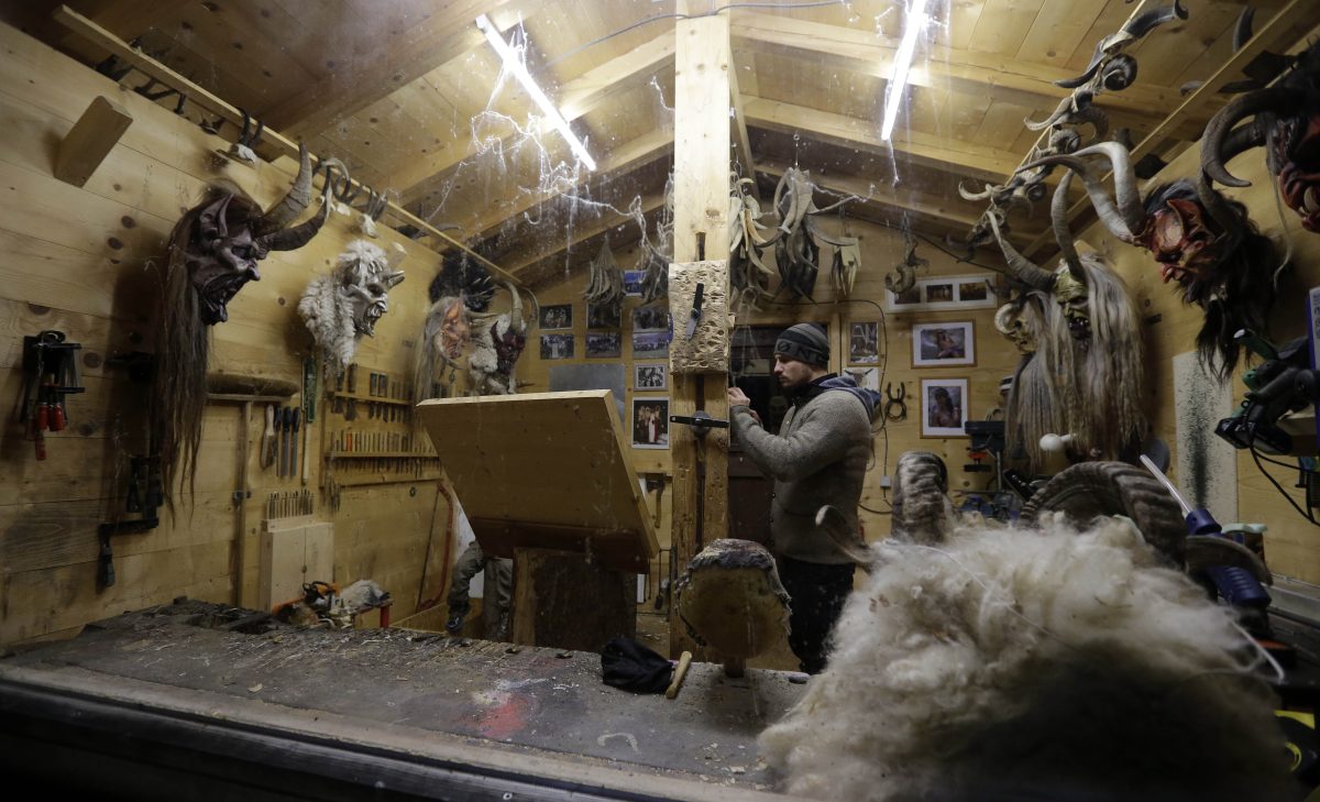 Wood carver Hansi Schwabl, 26, works on a traditional wooden Perchten mask in his factory in Inzell, Germany. The masks are made for Buttnmandl and Perchten parades around the Alp regions in southern Germany and Austria. During Buttnmandl parades, unmarried men, known as Buttnmandl and Krampusse, are dressed in straw or skins with wooden masks or skins over their heads and large cowbells tied around their hips. They follow Saint Nicholas from house to house on Dec. 5 and 6 every year to bring luck to those who are good and punish those who aren’t. The Perchten parades are held after Christmas.