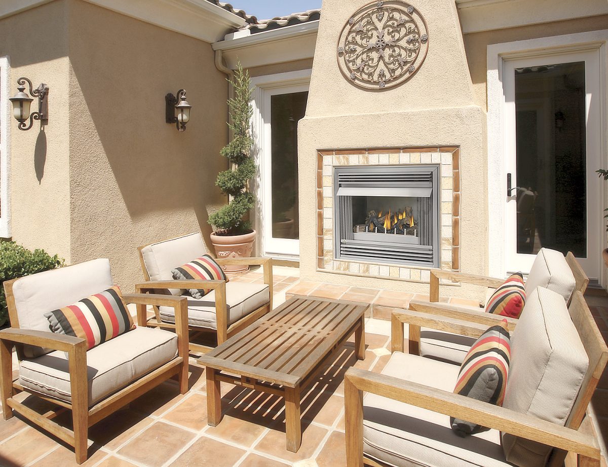 The outdoor gas fireplace shown here from Napoleon has a 100 percent stainless-steel construction that withstands the toughest outdoor environments. There’s no venting or chimney required, which makes it perfect for any spot in your garden. Create a surround that matches or complements your home’s exterior with tiles, stucco or stone.